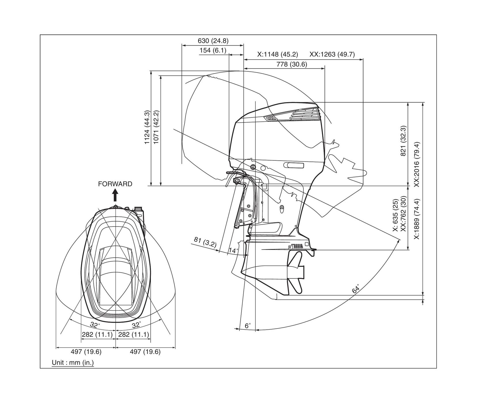 - Транец плавсредства: 762 (XX) — длинная версия для высокого транца