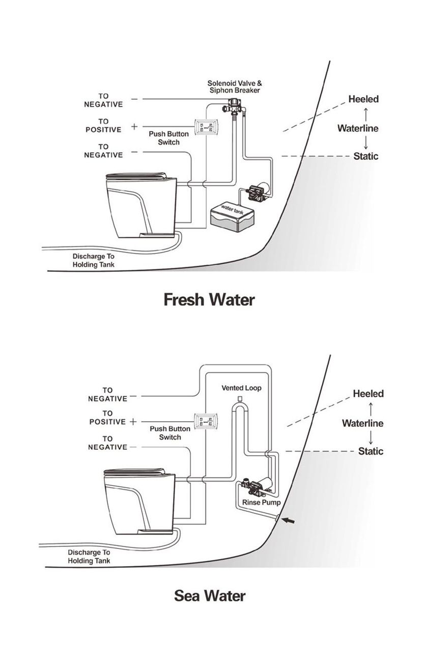 - Полная безопасность и соответствие стандартам: предусмотрены решения для предотвращения обратного сифонажа (сифонный разрыв, антисифонные петли). Унитаз сертифицирован как устройство для обработки сточных вод Типа I, II и III (U.S.C.G.), что позволяет сбрасывать отходы за борт (где разрешено) или в накопительный бак.